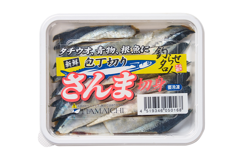 鮮度の良いメヂカ(ソウダガツオ)をひとくちサイズにカットしてワタであえ、急速冷凍しています。海上釣り堀の最強エサ。