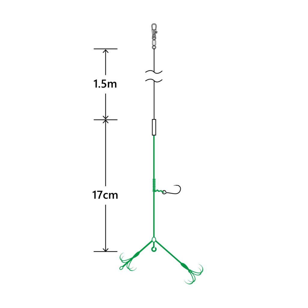 段差になったダブルの錨で、アオリイカを絡めるようにゲットします。警戒されにくいグリーンカラーに仕上げています。