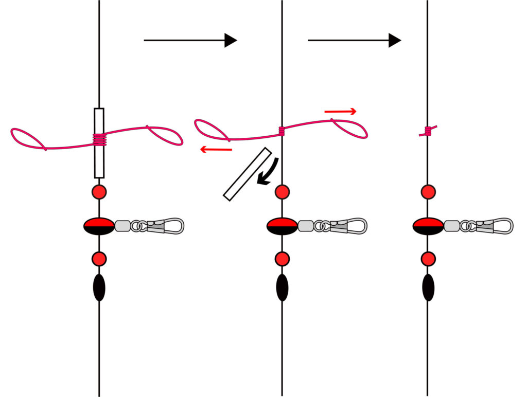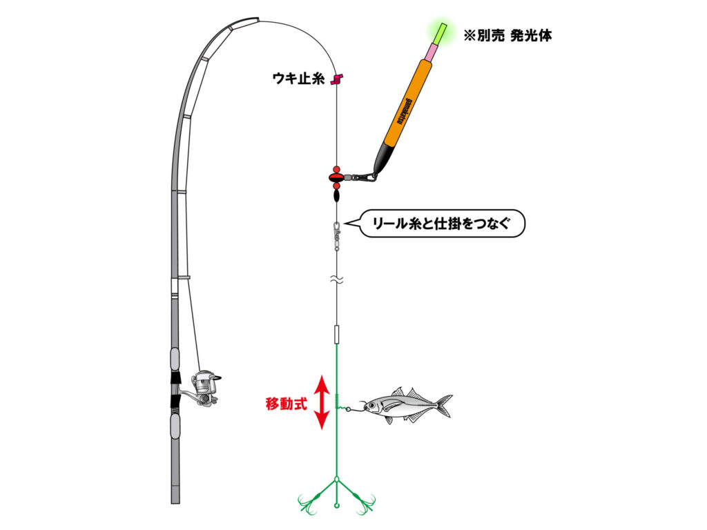 タナを合わせれるように、ウキ仕掛けは遊動出来るようにします。