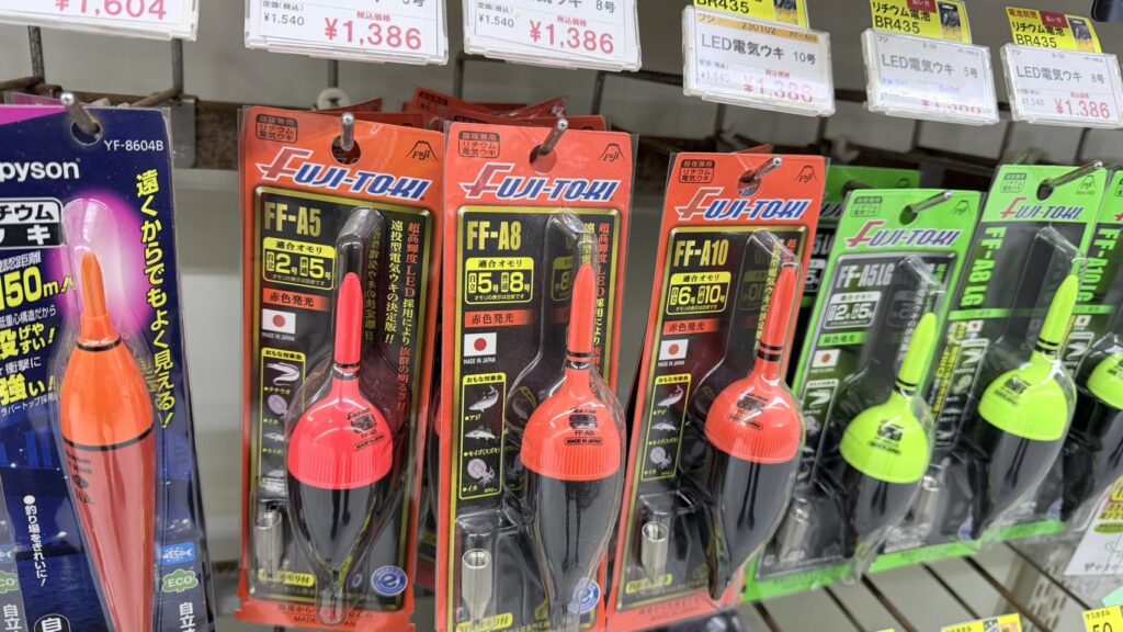 当店で一番売れているのは、画像中央の赤い電気ウキです。(フジ灯器)