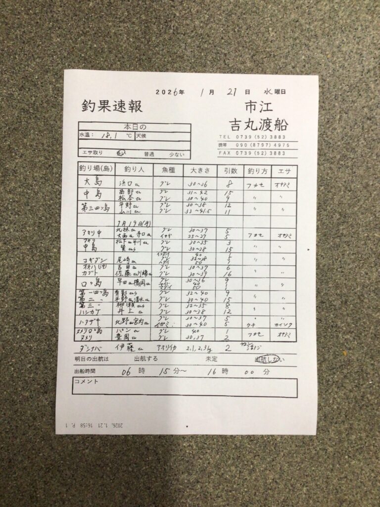 1月19・21日 白浜町市江 吉丸渡船さん釣果 2026 1/21 【渡船釣果】市江・日置・伊古木エリア 2026年1月21日 【渡船釣果】市江・日置・伊古木エリア よかったらシェアしてね! URLをコピーしました! URLをコピーしました! 1/21すさみ町見老津・林渡船さん釣果 1月21日(水)みなべ町 うえひら渡船さん釣果 この記事を書いた人 tsuttarou 関連記事 1/18(日)白浜町市江 吉丸渡船さん釣果 2026年1月18日 1/17白浜町市江 吉丸渡船さん釣果 2026年1月18日 1月15・16日 白浜町市江 吉丸渡船さん釣果 2026年1月16日 1/10白浜町市江 吉丸渡船さん釣果 2026年1月12日 1/9白浜町市江 吉丸渡船さん釣果 2026年1月12日 1/7白浜町市江 吉丸渡船さん釣果 2026年1月8日 1/6市江吉丸渡船さん釣果 2026年1月7日 白浜町市江 吉丸渡船さん釣果 2026年1月6日