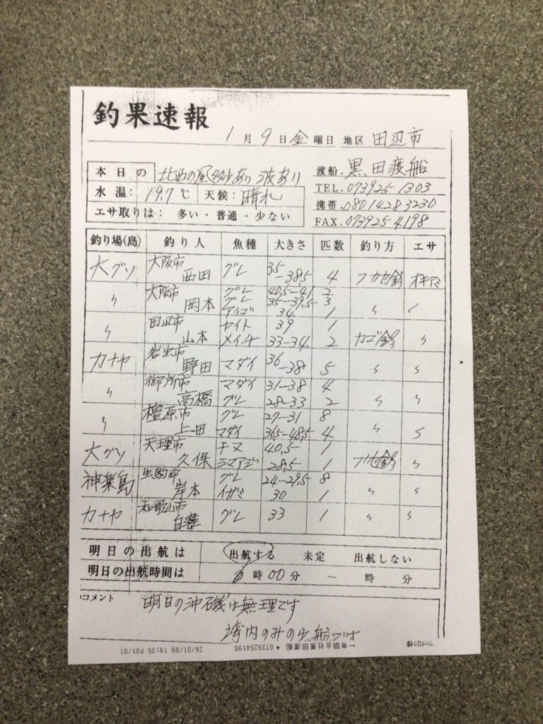 1月9日(金)田辺・黒田渡船さんの釣果 2026 1/09 【渡船釣果】みなべ・田辺エリア 2026年1月9日 【渡船釣果】みなべ・田辺エリア よかったらシェアしてね! URLをコピーしました! URLをコピーしました! 1/9すさみ町江住 前田渡船さん釣果 1/9 樫野・池畑渡船さんの釣果 この記事を書いた人 tsuttarou 関連記事 1月10日(土) 2026年1月10日 1月10日(土)みなべ町 うえひら渡船さん釣果 2026年1月10日 1月10日(土)みなべ町 築山渡船さん釣果 2026年1月10日 1/7 田辺・黒田渡船さんの釣果 2026年1月7日 1/5 みなべ・築山渡船さんの釣果 2026年1月5日 1/4(日)みなべ町 うえひら渡船さん釣果 2026年1月4日 1/3 田辺・黒田渡船さんの釣果 2026年1月3日 1/3 みなべ町 築山渡船さん釣果 2026年1月3日