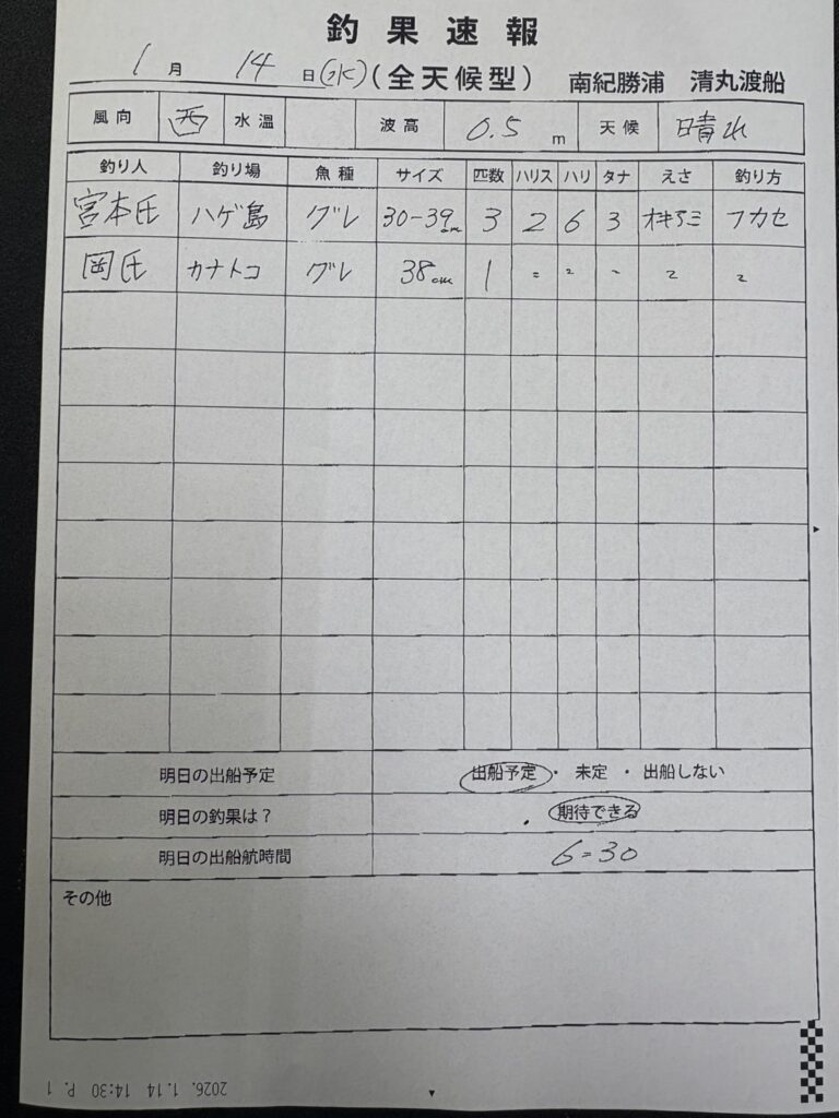 1/14那智勝浦町・清丸渡船さん釣果 2026 1/14 【渡船釣果】串本・太地・勝浦エリア 2026年1月14日 【渡船釣果】串本・太地・勝浦エリア よかったらシェアしてね! URLをコピーしました! URLをコピーしました! 1/14すさみ町江須崎・酒井渡船さん釣果 1/14すさみ町見老津・浜丸渡船さん釣果 この記事を書いた人 tsuttarou 関連記事 1/21 那智勝浦町・清丸渡船さん釣果 2026年1月22日 1/22 太地町・太師丸渡船さん釣果 2026年1月22日 1/22 串本町出雲・小川渡船さん釣果 2026年1月22日 1/21串本町樫野・池畑渡船さん釣果 2026年1月21日 串本町袋 かわばた渡船さん釣果 2026年1月20日 1/20那智勝浦町・清丸渡船さん釣果 2026年1月20日 1/20串本町出雲・小川渡船さん釣果 2026年1月20日 1/19那智勝浦町・清丸渡船さん釣果 2026年1月19日