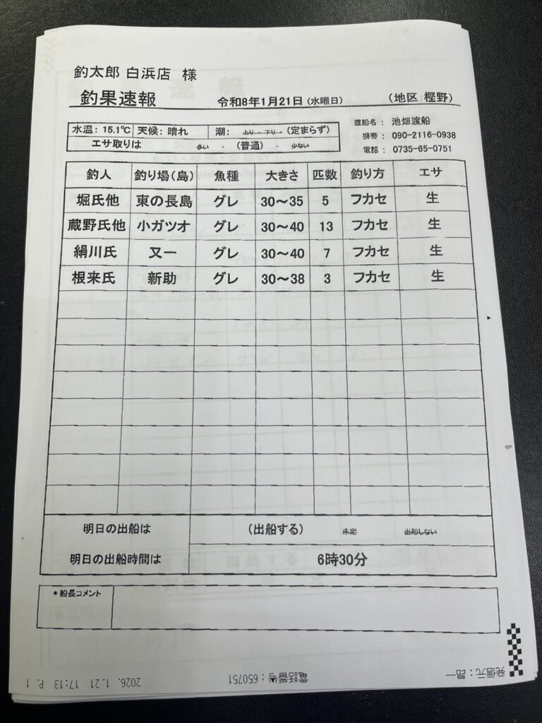 1/21串本町樫野・池畑渡船さん釣果 2026 1/21 【渡船釣果】串本・太地・勝浦エリア 2026年1月21日 【渡船釣果】串本・太地・勝浦エリア よかったらシェアしてね! URLをコピーしました! URLをコピーしました! 1/21すさみ町 岩元渡船さん釣果 1/21串本町出雲・小川渡船さん釣果 この記事を書いた人 tsuttarou 関連記事 串本町袋 かわばた渡船さん釣果 2026年1月20日 1/20那智勝浦町・清丸渡船さん釣果 2026年1月20日 1/20串本町出雲・小川渡船さん釣果 2026年1月20日 1/19那智勝浦町・清丸渡船さん釣果 2026年1月19日 1/19串本町田子・双島マリンクラブ渡船さん釣果 2026年1月19日 1/19串本町出雲・小川渡船さん釣果 2026年1月19日 1/19太地町・太師丸渡船さん釣果 2026年1月19日 1/18串本町出雲・小川渡船さん釣果 2026年1月18日