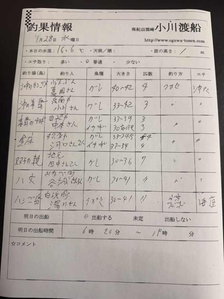 1/28 串本町出雲・小川渡船さん釣果 2026 1/28 釣果情報 【渡船釣果】串本・太地・勝浦エリア 2026年1月28日 釣果情報 【渡船釣果】串本・太地・勝浦エリア よかったらシェアしてね! URLをコピーしました! URLをコピーしました! 1/28 すさみ町見老津・浜丸渡船さん釣果 1/28 すさみ町見老津・林渡船さん釣果 この記事を書いた人 tsuttarou 関連記事 1/28 那智勝浦町・清丸渡船さん釣果 2026年1月28日 1/28 江須崎・酒井渡船さんの釣果 2026年1月28日 1/28 すさみ町江須崎・橋本渡船さん釣果 2026年1月28日 1/28 すさみ町見老津・林渡船さん釣果 2026年1月28日 1/28 すさみ町見老津・浜丸渡船さん釣果 2026年1月28日 1/27串本町田子・双島マリンクラブ渡船さん釣果 2026年1月27日 1/27串本町樫野・池畑渡船さん釣果 2026年1月27日 1/27串本町出雲・小川渡船さん釣果 2026年1月27日