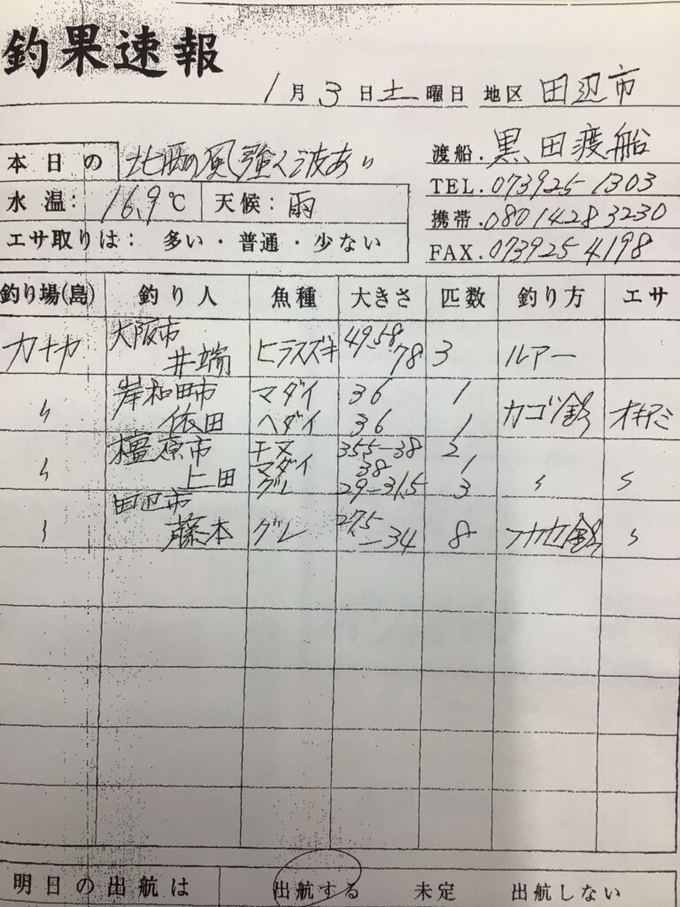 1/3 田辺・黒田渡船さんの釣果 2026 1/03 釣果情報 【渡船釣果】みなべ・田辺エリア 2026年1月3日 釣果情報 【渡船釣果】みなべ・田辺エリア よかったらシェアしてね! URLをコピーしました! URLをコピーしました! 1/3 みなべ町 築山渡船さん釣果 1/3 串本樫野 池畑渡船様 釣果 この記事を書いた人 tsuttarou 関連記事 1月10日(土) 2026年1月10日 1月10日(土)みなべ町 うえひら渡船さん釣果 2026年1月10日 1月10日(土)みなべ町 築山渡船さん釣果 2026年1月10日 1/10 串本町袋 かわばた渡船さん釣果 2026年1月10日 1/9 すさみ町見老津・林渡船さん釣果 2026年1月9日 1/9 すさみ町見老津・浜丸渡船さん釣果 2026年1月9日 1/9 樫野・池畑渡船さんの釣果 2026年1月9日 1月9日(金)田辺・黒田渡船さんの釣果 2026年1月9日