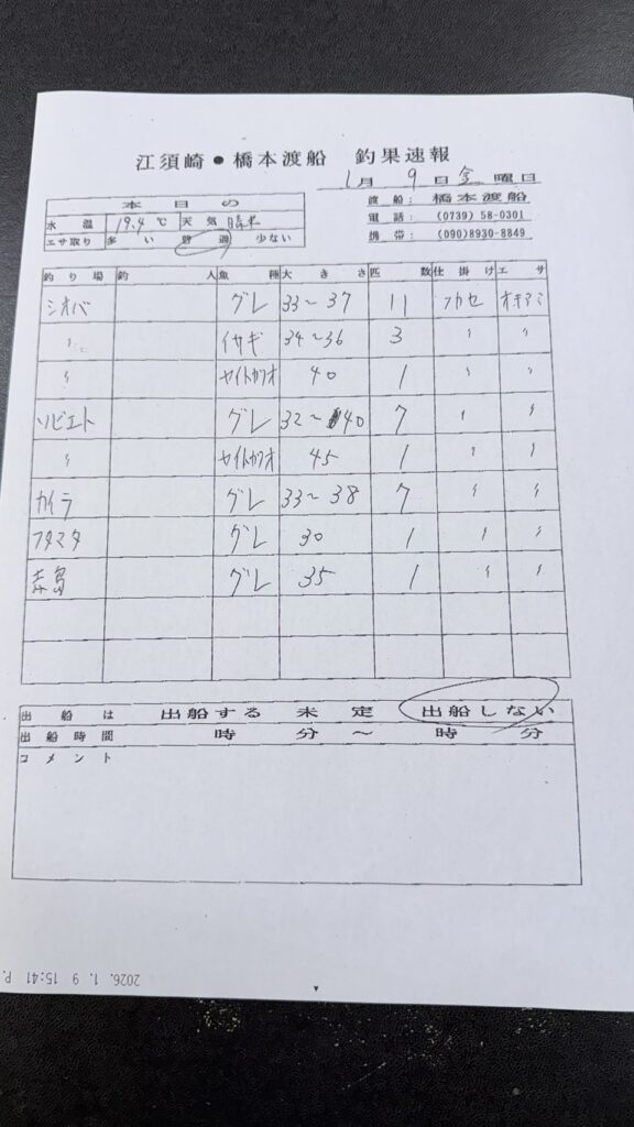 1/9すさみ町江須崎・橋本渡船さん釣果 2026 1/09 【渡船釣果】すさみエリア 2026年1月9日 【渡船釣果】すさみエリア よかったらシェアしてね! URLをコピーしました! URLをコピーしました! 1/9串本町田子・双島マリンクラブ渡船さん釣果 1/9すさみ町江須崎・酒井渡船さん釣果 この記事を書いた人 tsuttarou 関連記事 1/9 すさみ町見老津・林渡船さん釣果 2026年1月9日 1/9 すさみ町見老津・浜丸渡船さん釣果 2026年1月9日 1/9すさみ町江住 前田渡船さん釣果 2026年1月9日 1/9すさみ町江須崎・酒井渡船さん釣果 2026年1月9日 1/9すさみ町 岩元渡船さん釣果 2026年1月9日 1/8すさみ町見老津・浜丸渡船さん釣果 2026年1月8日 1/7すさみ町見老津・浜丸渡船さん釣果 2026年1月7日 1/7串本町田子・双島マリンクラブ渡船さん釣果 2026年1月7日