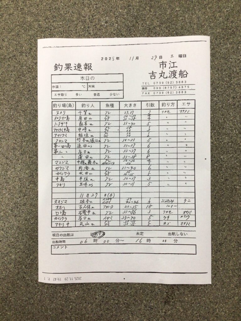 11月29日(土)白浜町市江 吉丸渡船さん釣果 2025 11/29 【渡船釣果】市江・日置・伊古木エリア 2025年11月29日 【渡船釣果】市江・日置・伊古木エリア よかったらシェアしてね! URLをコピーしました! URLをコピーしました! 11/29すさみ町江須崎・酒井渡船さん釣果 11/30すさみ町 岩元渡船さん釣果 この記事を書いた人 tsuttarou 関連記事 1月19・21日 白浜町市江 吉丸渡船さん釣果 2026年1月21日 1/18(日)白浜町市江 吉丸渡船さん釣果 2026年1月18日 1/17白浜町市江 吉丸渡船さん釣果 2026年1月18日 1月15・16日 白浜町市江 吉丸渡船さん釣果 2026年1月16日 1/10白浜町市江 吉丸渡船さん釣果 2026年1月12日 1/9白浜町市江 吉丸渡船さん釣果 2026年1月12日 1/7白浜町市江 吉丸渡船さん釣果 2026年1月8日 1/6市江吉丸渡船さん釣果 2026年1月7日