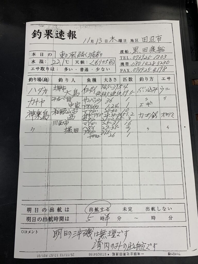 11/13田辺・黒田渡船さんの釣果 2025 11/13 【渡船釣果】みなべ・田辺エリア 2025年11月13日 【渡船釣果】みなべ・田辺エリア よかったらシェアしてね! URLをコピーしました! URLをコピーしました! 11/13みなべ町 うえひら渡船さん釣果 スタッフが予想する「明日は磯釣りいけるかな?」 この記事を書いた人 tsuttarou 関連記事 1月10日(土) 2026年1月10日 1月10日(土)みなべ町 うえひら渡船さん釣果 2026年1月10日 1月10日(土)みなべ町 築山渡船さん釣果 2026年1月10日 1月9日(金)田辺・黒田渡船さんの釣果 2026年1月9日 1/7 田辺・黒田渡船さんの釣果 2026年1月7日 1/5 みなべ・築山渡船さんの釣果 2026年1月5日 1/4(日)みなべ町 うえひら渡船さん釣果 2026年1月4日 1/3 田辺・黒田渡船さんの釣果 2026年1月3日