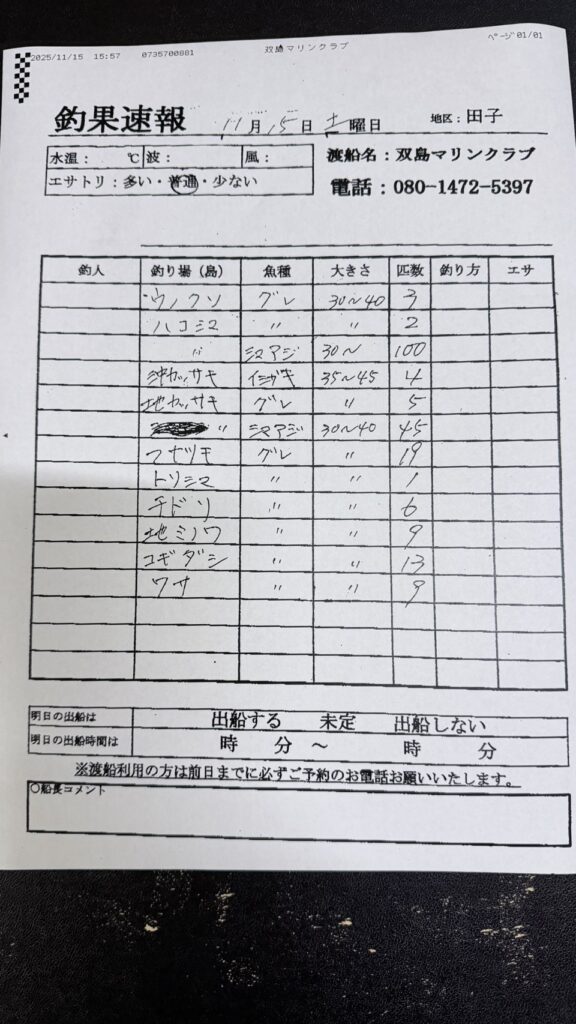11/15串本町田子・双島マリンクラブ渡船さん釣果 2025 11/15 【渡船釣果】串本・太地・勝浦エリア 2025年11月15日 【渡船釣果】串本・太地・勝浦エリア よかったらシェアしてね! URLをコピーしました! URLをコピーしました! 11/15串本町出雲・小川渡船さん釣果 11/15すさみ町江須崎・橋本渡船さん釣果 この記事を書いた人 tsuttarou 関連記事 1/21 那智勝浦町・清丸渡船さん釣果 2026年1月22日 1/22 太地町・太師丸渡船さん釣果 2026年1月22日 1/22 串本町出雲・小川渡船さん釣果 2026年1月22日 1/21串本町樫野・池畑渡船さん釣果 2026年1月21日 串本町袋 かわばた渡船さん釣果 2026年1月20日 1/20那智勝浦町・清丸渡船さん釣果 2026年1月20日 1/20串本町出雲・小川渡船さん釣果 2026年1月20日 1/19那智勝浦町・清丸渡船さん釣果 2026年1月19日