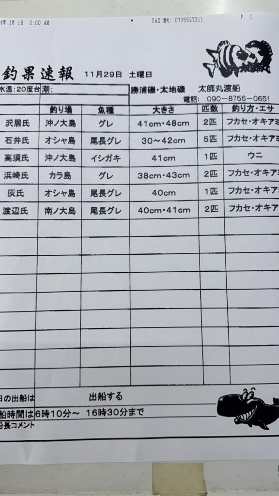 11/29太地町・太師丸渡船さん釣果 2025 11/29 【渡船釣果】串本・太地・勝浦エリア 2025年11月29日 【渡船釣果】串本・太地・勝浦エリア よかったらシェアしてね! URLをコピーしました! URLをコピーしました! 田辺・黒田渡船さんの釣果 11/29すさみ町江須崎・酒井渡船さん釣果 この記事を書いた人 tsuttarou 関連記事 1/21 那智勝浦町・清丸渡船さん釣果 2026年1月22日 1/22 太地町・太師丸渡船さん釣果 2026年1月22日 1/22 串本町出雲・小川渡船さん釣果 2026年1月22日 1/21串本町樫野・池畑渡船さん釣果 2026年1月21日 串本町袋 かわばた渡船さん釣果 2026年1月20日 1/20那智勝浦町・清丸渡船さん釣果 2026年1月20日 1/20串本町出雲・小川渡船さん釣果 2026年1月20日 1/19那智勝浦町・清丸渡船さん釣果 2026年1月19日