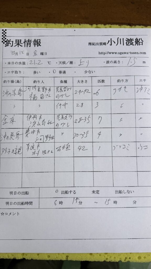 12/12串本町出雲・小川渡船さん釣果 2025 12/12 【渡船釣果】串本・太地・勝浦エリア 2025年12月12日 【渡船釣果】串本・太地・勝浦エリア よかったらシェアしてね! URLをコピーしました! URLをコピーしました! 田辺市内の堤防で尺アジ(30cm超)炸裂中!眠っている場合じゃない、勝負は「午前2時」からです。 12/12すさみ町見老津・浜丸渡船さん釣果 この記事を書いた人 tsuttarou 関連記事 1/11太地町・太師丸渡船さん釣果 2026年1月11日 1/11串本町出雲・小川渡船さん釣果 2026年1月11日 1/11那智勝浦町・清丸渡船さん釣果 2026年1月11日 1/10太地町・太師丸渡船さん釣果 2026年1月10日 1/10那智勝浦町・清丸渡船さん釣果 2026年1月10日 1/10串本町出雲・小川渡船さん釣果 2026年1月10日 1/10 串本町袋 かわばた渡船さん釣果 2026年1月10日 1/9 樫野・池畑渡船さんの釣果 2026年1月9日