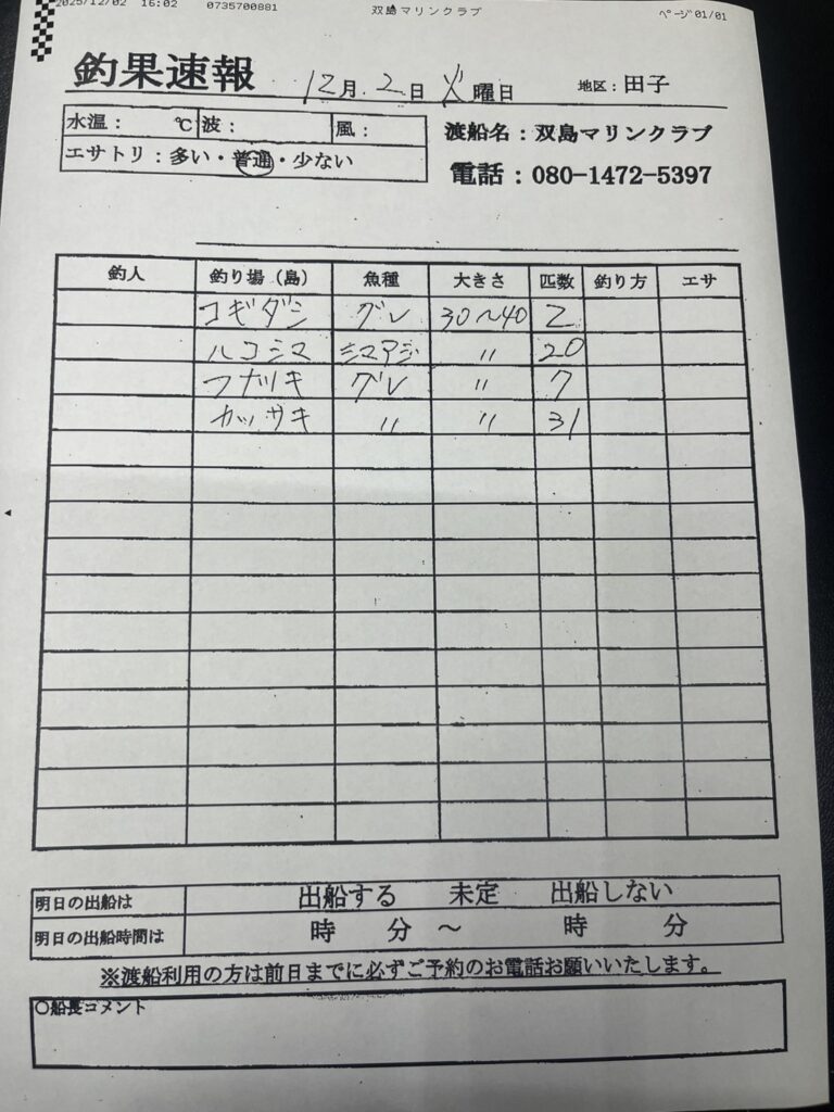 12/2串本町田子・双島マリンクラブ渡船さん釣果 2025 12/02 【渡船釣果】串本・太地・勝浦エリア 2025年12月2日 【渡船釣果】串本・太地・勝浦エリア よかったらシェアしてね! URLをコピーしました! URLをコピーしました! 12/2すさみ町見老津・浜丸渡船さん釣果 12/2すさみ町見老津・林渡船さん釣果 この記事を書いた人 tsuttarou 関連記事 1/21 那智勝浦町・清丸渡船さん釣果 2026年1月22日 1/22 太地町・太師丸渡船さん釣果 2026年1月22日 1/22 串本町出雲・小川渡船さん釣果 2026年1月22日 1/21串本町樫野・池畑渡船さん釣果 2026年1月21日 串本町袋 かわばた渡船さん釣果 2026年1月20日 1/20那智勝浦町・清丸渡船さん釣果 2026年1月20日 1/20串本町出雲・小川渡船さん釣果 2026年1月20日 1/19那智勝浦町・清丸渡船さん釣果 2026年1月19日