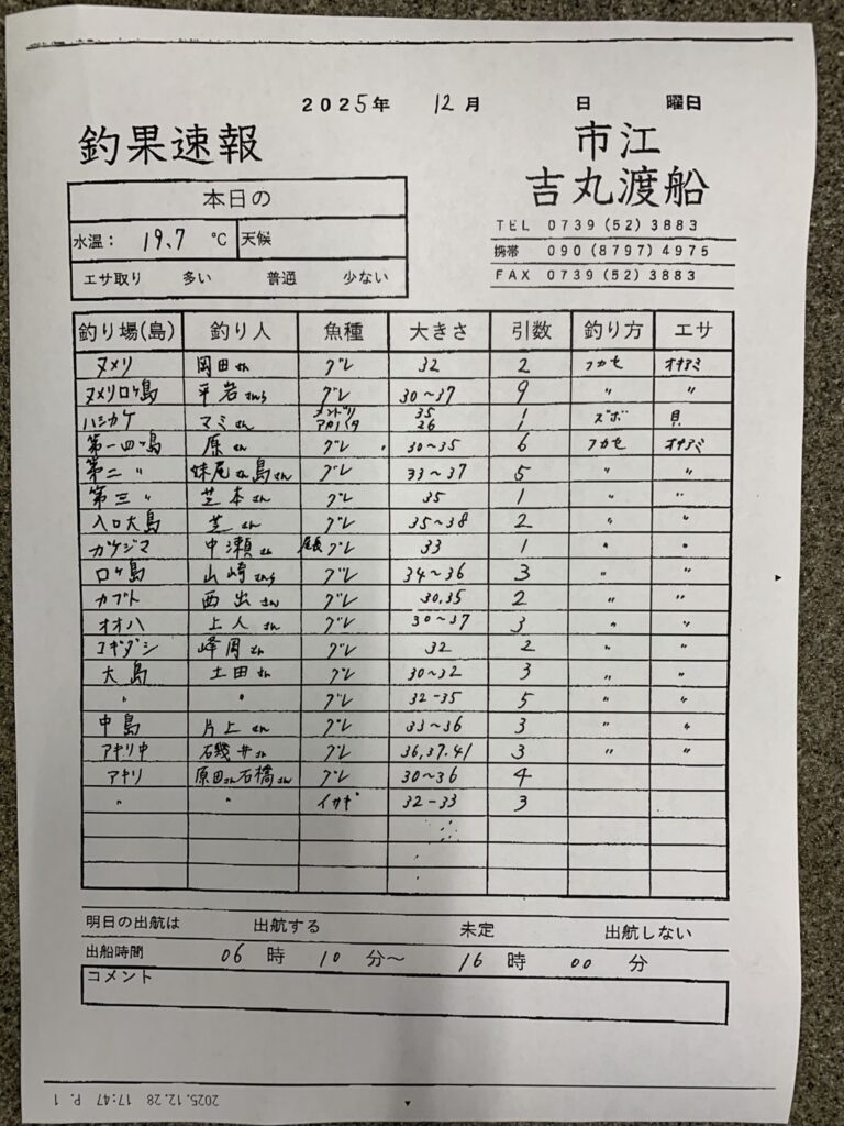 12/28白浜町市江 吉丸渡船さん釣果 2025 12/28 【渡船釣果】市江・日置・伊古木エリア 2025年12月28日 【渡船釣果】市江・日置・伊古木エリア よかったらシェアしてね! URLをコピーしました! URLをコピーしました! 12/28すさみ町江須崎・橋本渡船さん釣果 12/28すさみ町 岩元渡船さん釣果 この記事を書いた人 tsuttarou 関連記事 1/7白浜町市江 吉丸渡船さん釣果 2026年1月8日 1/6市江吉丸渡船さん釣果 2026年1月7日 白浜町市江 吉丸渡船さん釣果 2026年1月6日 1/4(日)白浜町市江 吉丸渡船さん釣果 2026年1月4日 12/27 白浜町市江 吉丸渡船さん釣果 2025年12月27日 12/23日置・三倉渡船さん釣果 2025年12月23日 12/18白浜町市江 吉丸渡船さん釣果 2025年12月19日 12/16 白浜町市江 吉丸渡船さん釣果 2025年12月16日