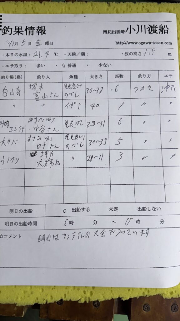 12/5串本町出雲・小川渡船さん釣果 2025 12/05 【渡船釣果】串本・太地・勝浦エリア 2025年12月5日 【渡船釣果】串本・太地・勝浦エリア よかったらシェアしてね! URLをコピーしました! URLをコピーしました! 12/5すさみ町江須崎・橋本渡船さん釣果 12/5串本町田子・双島マリンクラブ渡船さん釣果 この記事を書いた人 tsuttarou 関連記事 1/11太地町・太師丸渡船さん釣果 2026年1月11日 1/11串本町出雲・小川渡船さん釣果 2026年1月11日 1/11那智勝浦町・清丸渡船さん釣果 2026年1月11日 1/10太地町・太師丸渡船さん釣果 2026年1月10日 1/10那智勝浦町・清丸渡船さん釣果 2026年1月10日 1/10串本町出雲・小川渡船さん釣果 2026年1月10日 1/10 串本町袋 かわばた渡船さん釣果 2026年1月10日 1/9 樫野・池畑渡船さんの釣果 2026年1月9日