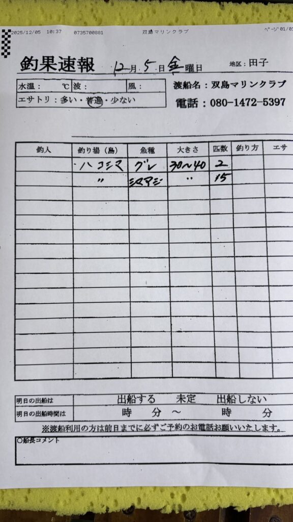 12/5串本町田子・双島マリンクラブ渡船さん釣果 2025 12/05 【渡船釣果】串本・太地・勝浦エリア 2025年12月5日 【渡船釣果】串本・太地・勝浦エリア よかったらシェアしてね! URLをコピーしました! URLをコピーしました! 12/5串本町出雲・小川渡船さん釣果 12/6 すさみ 岩元渡船さん この記事を書いた人 tsuttarou 関連記事 2/24太地町・太師丸渡船さん釣果 2026年2月26日 2/24串本町田子・双島マリンクラブ渡船さん釣果 2026年2月26日 2/24串本町出雲・小川渡船さん釣果 2026年2月26日 2/23太地町・太師丸渡船さん釣果 2026年2月23日 2/23那智勝浦町・清丸渡船さん釣果 2026年2月23日 2/22串本町田子・双島マリンクラブ渡船さん釣果 2026年2月22日 2/22太地町・太師丸渡船さん釣果 2026年2月22日 2/22那智勝浦町・清丸渡船さん釣果 2026年2月22日