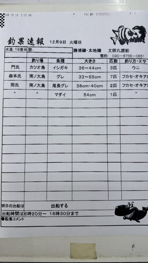 12/9太地町・太師丸渡船さん釣果 2025 12/09 【渡船釣果】串本・太地・勝浦エリア 2025年12月9日 【渡船釣果】串本・太地・勝浦エリア よかったらシェアしてね! URLをコピーしました! URLをコピーしました! 12/8 白浜町市江 吉丸渡船さん釣果 12/9すさみ町江須崎・橋本渡船さん釣果 この記事を書いた人 tsuttarou 関連記事 1/21 那智勝浦町・清丸渡船さん釣果 2026年1月22日 1/22 太地町・太師丸渡船さん釣果 2026年1月22日 1/22 串本町出雲・小川渡船さん釣果 2026年1月22日 1/21串本町樫野・池畑渡船さん釣果 2026年1月21日 串本町袋 かわばた渡船さん釣果 2026年1月20日 1/20那智勝浦町・清丸渡船さん釣果 2026年1月20日 1/20串本町出雲・小川渡船さん釣果 2026年1月20日 1/19那智勝浦町・清丸渡船さん釣果 2026年1月19日