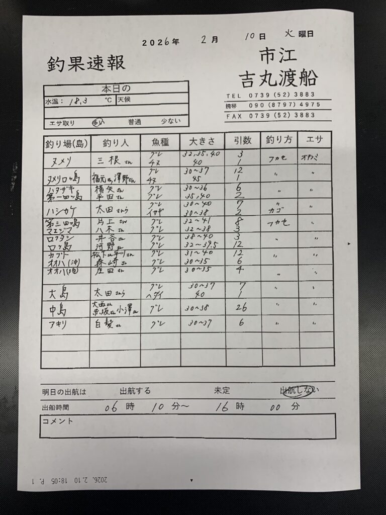 2/10白浜町市江 吉丸渡船さん釣果 2026 2/12 【渡船釣果】市江・日置・伊古木エリア 2026年2月12日 【渡船釣果】市江・日置・伊古木エリア よかったらシェアしてね! URLをコピーしました! URLをコピーしました! 2/10太地町・太師丸渡船さん釣果 2/10田辺・黒田渡船さんの釣果 この記事を書いた人 tsuttarou 関連記事 2/16白浜町市江 吉丸渡船さん釣果 2026年2月16日 2/14 白浜町市江 吉丸渡船さん釣果 2026年2月14日 2/13 白浜町市江 吉丸渡船さん釣果 2026年2月13日 2/6 白浜町市江 吉丸渡船さん釣果 2026年2月6日 2/5 白浜町市江 吉丸渡船さん釣果 2026年2月6日 2/2白浜町市江 吉丸渡船さん釣果 2026年2月3日 1/31(土)白浜町市江 吉丸渡船さん釣果 2026年1月31日 1/28白浜町市江 吉丸渡船さん釣果 2026年1月30日