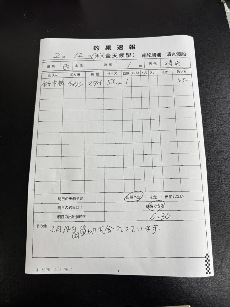 2/12 那智勝浦町・清丸渡船さん釣果 2026 2/12 釣果情報 【渡船釣果】串本・太地・勝浦エリア 2026年2月12日 釣果情報 【渡船釣果】串本・太地・勝浦エリア よかったらシェアしてね! URLをコピーしました! URLをコピーしました! 2/12 串本町田子・双島マリンクラブ渡船さん釣果 2/12 すさみ町見老津・浜丸渡船さん釣果 この記事を書いた人 tsuttarou 関連記事 2/16串本町出雲・小川渡船さん釣果 2026年2月16日 2/16串本町田子・双島マリンクラブ渡船さん釣果 2026年2月16日 2/16那智勝浦町・清丸渡船さん釣果 2026年2月16日 2/15 田辺・黒田渡船さんの釣果 2026年2月15日 2/15 みなべ町 築山渡船さん釣果 2026年2月15日 2/15太地町・太師丸渡船さん釣果 2026年2月15日 2/15 みなべ町 うえひら渡船さん釣果 2026年2月15日 2/15串本町田子・双島マリンクラブ渡船さん釣果 2026年2月15日