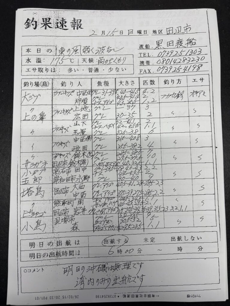 2/15 田辺・黒田渡船さんの釣果 2026 2/15 釣果情報 【渡船釣果】みなべ・田辺エリア 2026年2月15日 釣果情報 【渡船釣果】みなべ・田辺エリア よかったらシェアしてね! URLをコピーしました! URLをコピーしました! 2/15すさみ町江須崎・酒井渡船さん釣果 この記事を書いた人 tsuttarou 関連記事 2/15 みなべ町 築山渡船さん釣果 2026年2月15日 2/15 みなべ町 うえひら渡船さん釣果 2026年2月15日 2/15 串本・かわばた渡船さんの釣果 2026年2月15日 2/14 みなべ町 築山渡船さん釣果 2026年2月14日 2/14 みなべ町 うえひら渡船さん釣果 2026年2月14日 2/14 田辺・黒田渡船さんの釣果 2026年2月14日 2/14 串本町樫野池畑渡船さんの釣果 2026年2月14日 2/13 白浜町市江 吉丸渡船さん釣果 2026年2月13日