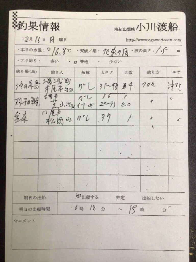 2/16串本町出雲・小川渡船さん釣果 2026 2/16 【渡船釣果】串本・太地・勝浦エリア 2026年2月16日 【渡船釣果】串本・太地・勝浦エリア よかったらシェアしてね! URLをコピーしました! URLをコピーしました! 2/16串本町田子・双島マリンクラブ渡船さん釣果 この記事を書いた人 tsuttarou 関連記事 2/16串本町田子・双島マリンクラブ渡船さん釣果 2026年2月16日 2/16那智勝浦町・清丸渡船さん釣果 2026年2月16日 2/15太地町・太師丸渡船さん釣果 2026年2月15日 2/15串本町田子・双島マリンクラブ渡船さん釣果 2026年2月15日 2/15那智勝浦町・清丸渡船さん釣果 2026年2月15日 2/15串本町出雲・小川渡船さん釣果 2026年2月15日 2/15 串本・かわばた渡船さんの釣果 2026年2月15日 2/14太地町・太師丸渡船さん釣果 2026年2月14日
