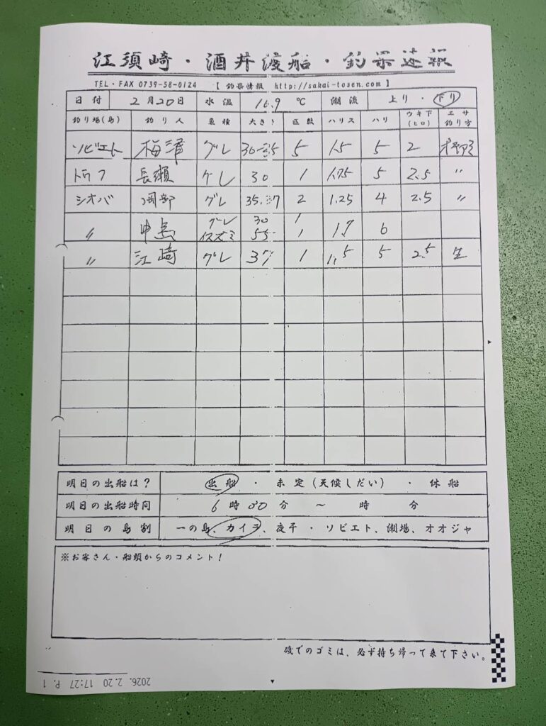2/20すさみ江須崎・酒井渡船さん釣果 2026 2/20 釣果情報 【渡船釣果】すさみエリア 2026年2月20日 釣果情報 【渡船釣果】すさみエリア よかったらシェアしてね! URLをコピーしました! URLをコピーしました! 2/20 すさみ町見老津・浜丸渡船さん釣果 2/20すさみ江須崎・橋本渡船さん釣果 この記事を書いた人 tsuttarou 関連記事 2/21 みなべ町 築山渡船さん釣果 2026年2月21日 2/21 すさみ町江須崎・酒井渡船さん釣果 2026年2月21日 2/21 すさみ町見老津・林渡船さん釣果 2026年2月21日 2/21 みなべ町 うえひら渡船さん釣果 2026年2月21日 2/21 串本・かわばた渡船さんの釣果 2026年2月21日 2/21 すさみ町江須崎・橋本渡船さん釣果 2026年2月21日 2/21 すさみ町見老津・浜丸渡船さん釣果 2026年2月21日 2/21 すさみ町 岩元渡船さん釣果 2026年2月21日