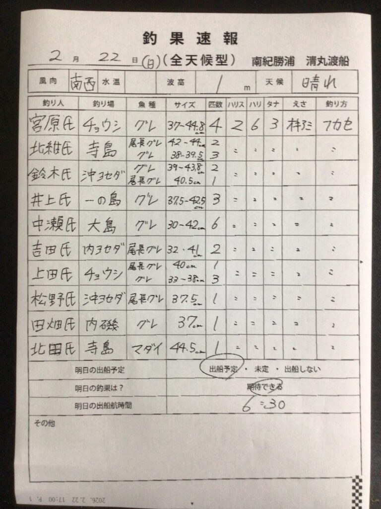 2/22那智勝浦町・清丸渡船さん釣果 2026 2/22 【渡船釣果】串本・太地・勝浦エリア 2026年2月22日 【渡船釣果】串本・太地・勝浦エリア よかったらシェアしてね! URLをコピーしました! URLをコピーしました! 2/22すさみ町見老津・林渡船さん釣果 2/22太地町・太師丸渡船さん釣果 この記事を書いた人 tsuttarou 関連記事 2/23太地町・太師丸渡船さん釣果 2026年2月23日 2/23那智勝浦町・清丸渡船さん釣果 2026年2月23日 2/22串本町田子・双島マリンクラブ渡船さん釣果 2026年2月22日 2/22太地町・太師丸渡船さん釣果 2026年2月22日 2/22串本町出雲・小川渡船さん釣果 2026年2月22日 2/22(日)串本町袋 かわばた渡船さん釣果 2026年2月22日 2/21 太地町・太師丸渡船さん釣果 2026年2月21日 2/21 串本・かわばた渡船さんの釣果 2026年2月21日