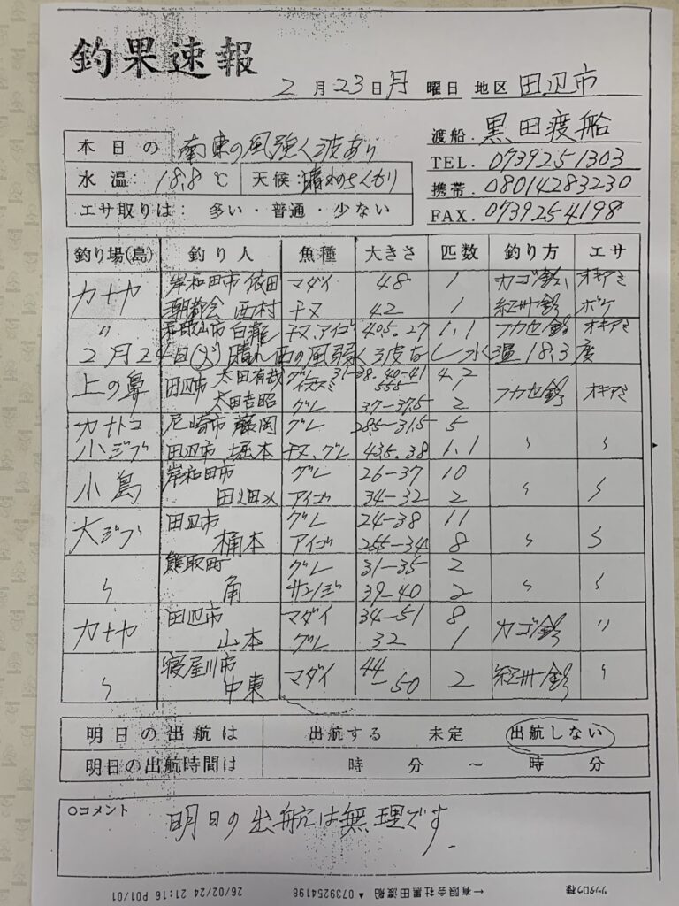 2/23田辺・黒田渡船さんの釣果 2026 2/26 【渡船釣果】みなべ・田辺エリア 2026年2月26日 【渡船釣果】みなべ・田辺エリア よかったらシェアしてね! URLをコピーしました! URLをコピーしました! 2/24白浜町市江 吉丸渡船さん釣果 2/26みなべ町 うえひら渡船さん釣果 この記事を書いた人 tsuttarou 関連記事 2/24みなべ町 築山渡船さん釣果 2026年2月26日 2/26みなべ町 うえひら渡船さん釣果 2026年2月26日 2/23(月)みなべ町 築山渡船さん釣果 2026年2月23日 2/22(日)田辺・黒田渡船さんの釣果 2026年2月22日 2/22(日)みなべ町 うえひら渡船さん釣果 2026年2月22日 2/22(日)みなべ町 築山渡船さん釣果 2026年2月22日 2/21 田辺・黒田渡船さんの釣果 2026年2月21日 2/21 みなべ町 築山渡船さん釣果 2026年2月21日