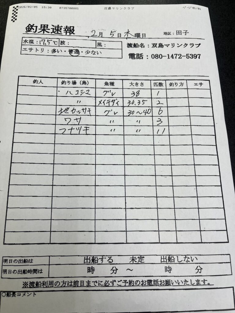 2/5串本町田子・双島マリンクラブ渡船さん釣果 2026 2/05 【渡船釣果】串本・太地・勝浦エリア 2026年2月5日 【渡船釣果】串本・太地・勝浦エリア よかったらシェアしてね! URLをコピーしました! URLをコピーしました! 2/5すさみ町見老津・林渡船さん釣果 2/5那智勝浦町・清丸渡船さん釣果 この記事を書いた人 tsuttarou 関連記事 2/6串本町田子・双島マリンクラブ渡船さん釣果 2026年2月6日 2/6串本町出雲・小川渡船さん釣果 2026年2月6日 2/6太地町・太師丸渡船さん釣果 2026年2月6日 2/6那智勝浦町・清丸渡船さん釣果 2026年2月6日 2/5那智勝浦町・清丸渡船さん釣果 2026年2月5日 2/5串本町出雲・小川渡船さん釣果 2026年2月5日 2/4 串本町出雲・小川渡船さん釣果 2026年2月4日 2/4 串本町田子・双島マリンクラブ渡船さん釣果 2026年2月4日