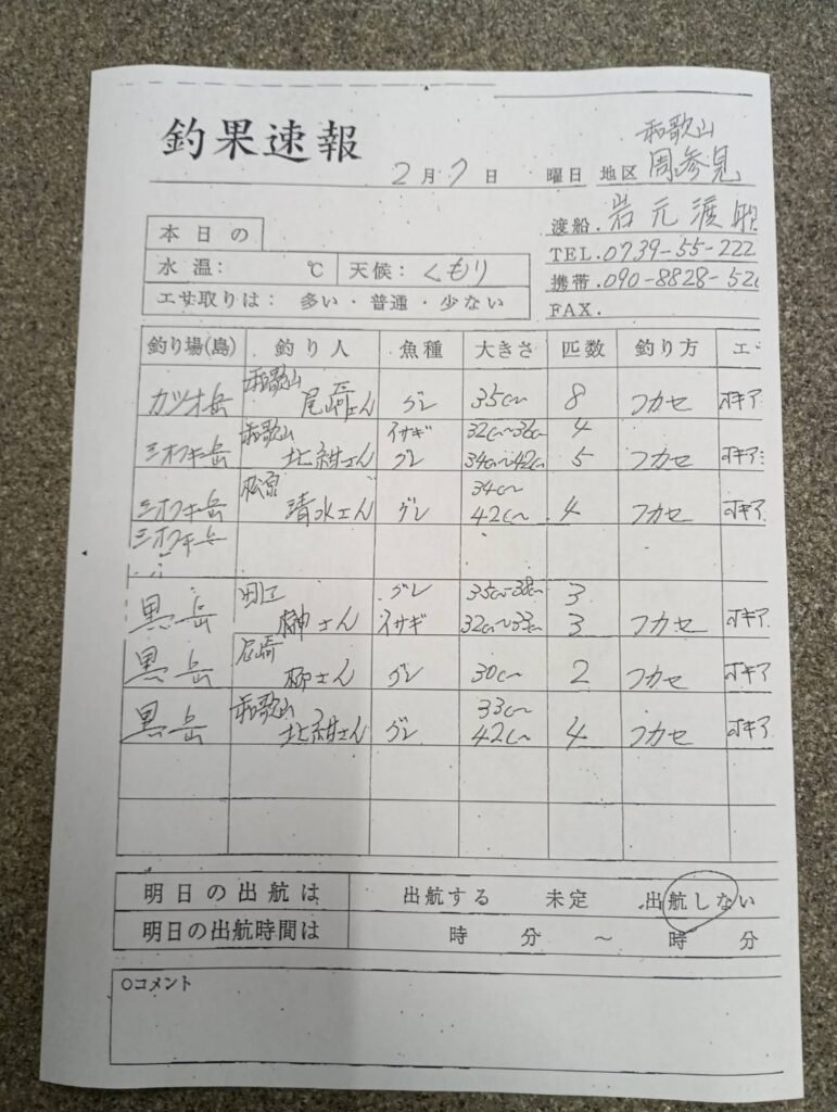 2/7すさみ町 岩元渡船さん釣果 2026 2/07 【渡船釣果】すさみエリア 2026年2月7日 【渡船釣果】すさみエリア よかったらシェアしてね! URLをコピーしました! URLをコピーしました! 2/6串本町田子・双島マリンクラブ渡船さん釣果 2/7太地町・太師丸渡船さん釣果 この記事を書いた人 tsuttarou 関連記事 2/7すさみ町見老津・林渡船さん釣果 2026年2月7日 2/7すさみ町江須崎・橋本渡船さん釣果 2026年2月7日 2/7すさみ町見老津・浜丸渡船さん釣果 2026年2月7日 2/6すさみ町江須崎・酒井渡船さん釣果 2026年2月6日 2/6すさみ町見老津・浜丸渡船さん釣果 2026年2月6日 2/6すさみ町見老津・林渡船さん釣果 2026年2月6日 2/6 すさみ町 岩元渡船さん釣果 2026年2月6日 2/5すさみ町江須崎・酒井渡船さん釣果 2026年2月5日