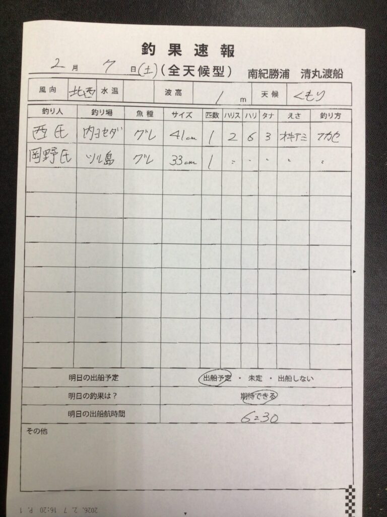 2/7那智勝浦町・清丸渡船さん釣果 2026 2/07 【渡船釣果】串本・太地・勝浦エリア 2026年2月7日 【渡船釣果】串本・太地・勝浦エリア よかったらシェアしてね! URLをコピーしました! URLをコピーしました! 2/7串本町田子・双島マリンクラブ渡船さん釣果 2/7すさみ町見老津・林渡船さん釣果 この記事を書いた人 tsuttarou 関連記事 2/7串本町樫野・池畑渡船さん釣果 2026年2月7日 2/7串本町田子・双島マリンクラブ渡船さん釣果 2026年2月7日 2/7串本町出雲・小川渡船さん釣果 2026年2月7日 2/7太地町・太師丸渡船さん釣果 2026年2月7日 2/6串本町田子・双島マリンクラブ渡船さん釣果 2026年2月6日 2/6串本町出雲・小川渡船さん釣果 2026年2月6日 2/6太地町・太師丸渡船さん釣果 2026年2月6日 2/6那智勝浦町・清丸渡船さん釣果 2026年2月6日