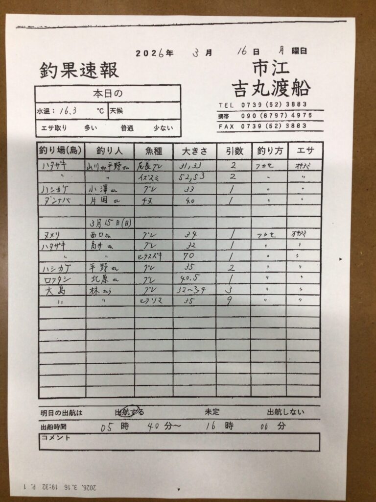 3/16 (月) 白浜町市江 吉丸渡船さん釣果 2026 3/16 【渡船釣果】市江・日置・伊古木エリア 2026年3月16日 【渡船釣果】市江・日置・伊古木エリア よかったらシェアしてね! URLをコピーしました! URLをコピーしました! 3/16(月)田辺・黒田渡船さんの釣果 3/17みなべ町 築山渡船さん釣果 この記事を書いた人 tsuttarou 関連記事 3/12 白浜町市江 吉丸渡船さん釣果 2026年3月12日 3/8・3/9 白浜町市江 吉丸渡船さん釣果 2026年3月9日 3/6 市江・吉丸渡船さんの釣果 2026年3月7日 3/4白浜町市江 吉丸渡船さん釣果 2026年3月4日 3/1(日)白浜町市江 吉丸渡船さん釣果 2026年3月1日 2/27 白浜町市江 吉丸渡船さん釣果 2026年2月27日 2/24白浜町市江 吉丸渡船さん釣果 2026年2月26日 2/22(日)白浜町市江 吉丸渡船さん釣果 2026年2月22日