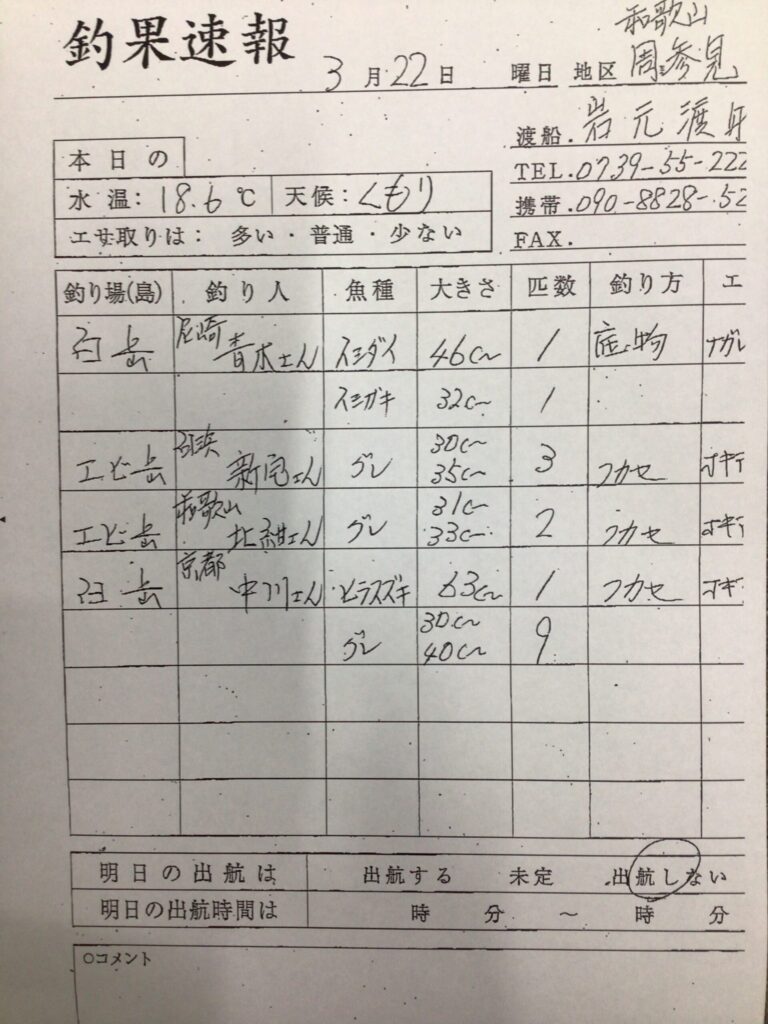 3/22(日)すさみ町 岩元渡船さん釣果 2026 3/22 【渡船釣果】すさみエリア 2026年3月22日 【渡船釣果】すさみエリア よかったらシェアしてね! URLをコピーしました! URLをコピーしました! 3/22串本町出雲・小川渡船さん釣果 3/22(日)串本町袋 かわばた渡船さん釣果 この記事を書いた人 tsuttarou 関連記事 3/22すさみ町見老津・浜丸渡船さん釣果 2026年3月22日 3/22すさみ町江須崎・橋本渡船さん釣果 2026年3月22日 3/21すさみ町見老津・浜丸渡船さん釣果 2026年3月21日 3/21すさみ町江須崎・酒井渡船さん釣果 2026年3月21日 3/21すさみ町見老津・林渡船さん釣果 2026年3月21日 3/21すさみ町江須崎・橋本渡船さん釣果 2026年3月21日 3/21 すさみ町岩元渡船さん釣果 2026年3月21日 3/20(金)すさみ町見老津・浜丸渡船さん釣果 2026年3月20日