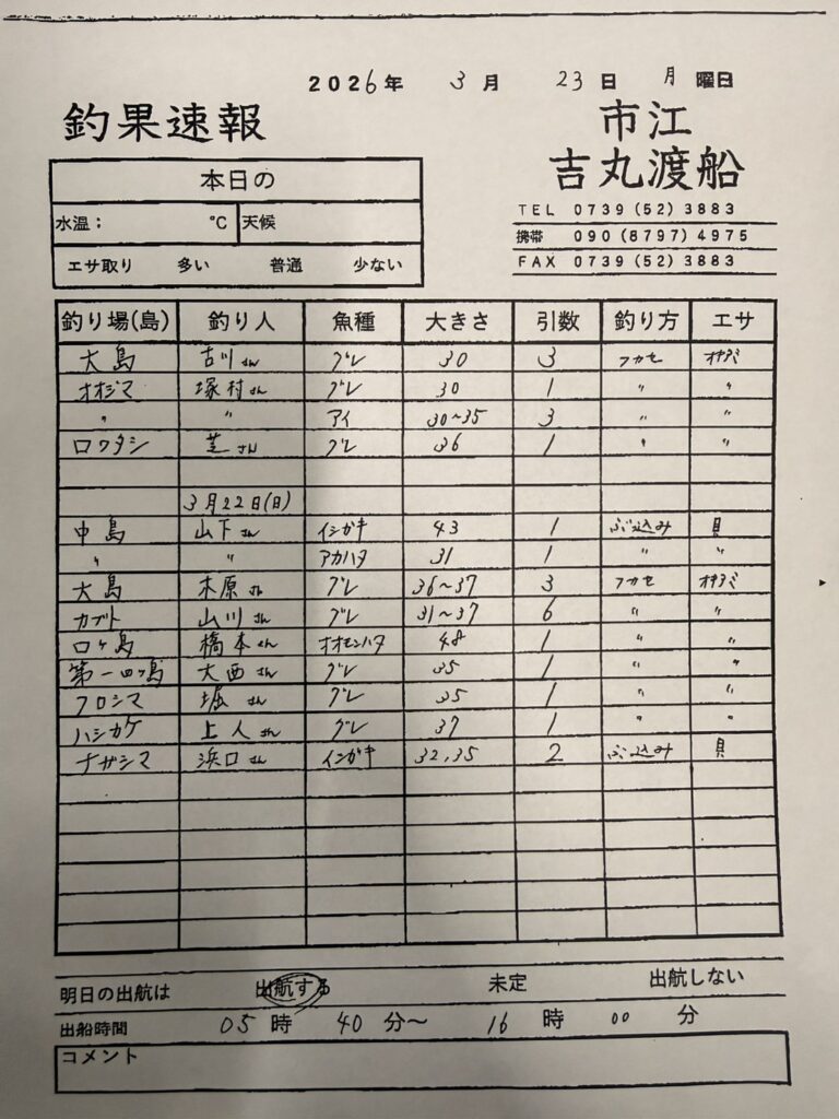 3/23 白浜町市江 吉丸渡船さん釣果 2026 3/23 釣果情報 【渡船釣果】市江・日置・伊古木エリア 2026年3月23日 釣果情報 【渡船釣果】市江・日置・伊古木エリア よかったらシェアしてね! URLをコピーしました! URLをコピーしました! 3/23 みなべ町 うえひら渡船さん釣果 3/23 田辺・黒田渡船さんの釣果 この記事を書いた人 tsuttarou 関連記事 3/23 田辺・黒田渡船さんの釣果 2026年3月23日 3/23 みなべ町 うえひら渡船さん釣果 2026年3月23日 3/23 すさみ町見老津・林渡船さん釣果 2026年3月23日 3/31 すさみ町見老津・浜丸渡船さん釣果 2026年3月23日 3/21 白浜町市江 吉丸渡船さん釣果 2026年3月21日 3/20(金)すさみ町見老津・浜丸渡船さん釣果 2026年3月20日 3/20(金)那智勝浦町・清丸渡船さん釣果 2026年3月20日 3/20(金)すさみ町江須崎・橋本渡船さん釣果 2026年3月20日