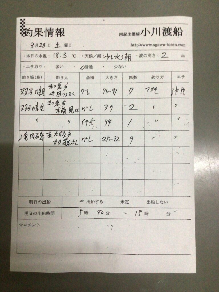 3/28串本町出雲・小川渡船さん釣果 2026 3/28 【渡船釣果】串本・太地・勝浦エリア 2026年3月28日 【渡船釣果】串本・太地・勝浦エリア よかったらシェアしてね! URLをコピーしました! URLをコピーしました! 3/28すさみ町見老津・浜丸渡船さん釣果 3/28 白浜町市江 吉丸渡船さん釣果 この記事を書いた人 tsuttarou 関連記事 3/29那智勝浦町・清丸渡船さん釣果 2026年3月29日 3/29串本町出雲・小川渡船さん釣果 2026年3月29日 3/28串本町田子・双島マリンクラブ渡船さん釣果 2026年3月28日 3/27串本町田子・双島マリンクラブ渡船さん釣果 2026年3月27日 3/25串本町出雲・小川渡船さん釣果 2026年3月25日 3/24串本町出雲・小川渡船さん釣果 2026年3月24日 3/22串本町田子・双島マリンクラブ渡船さん釣果 2026年3月22日 3/22(日)串本町袋 かわばた渡船さん釣果 2026年3月22日