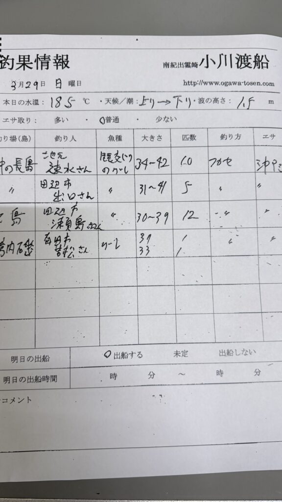 3/29串本町出雲・小川渡船さん釣果 2026 3/29 【渡船釣果】串本・太地・勝浦エリア 2026年3月29日 【渡船釣果】串本・太地・勝浦エリア よかったらシェアしてね! URLをコピーしました! URLをコピーしました! 3/29すさみ町江須崎・酒井渡船さん釣果 3/29すさみ町見老津・浜丸渡船さん釣果 この記事を書いた人 tsuttarou 関連記事 3/29那智勝浦町・清丸渡船さん釣果 2026年3月29日 3/28串本町出雲・小川渡船さん釣果 2026年3月28日 3/28串本町田子・双島マリンクラブ渡船さん釣果 2026年3月28日 3/27串本町田子・双島マリンクラブ渡船さん釣果 2026年3月27日 3/25串本町出雲・小川渡船さん釣果 2026年3月25日 3/24串本町出雲・小川渡船さん釣果 2026年3月24日 3/22串本町田子・双島マリンクラブ渡船さん釣果 2026年3月22日 3/22(日)串本町袋 かわばた渡船さん釣果 2026年3月22日