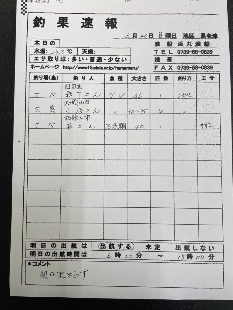 3/31 すさみ町見老津・浜丸渡船さん釣果 2026 3/23 釣果情報 【渡船釣果】すさみエリア 2026年3月23日 釣果情報 【渡船釣果】すさみエリア よかったらシェアしてね! URLをコピーしました! URLをコピーしました! 3/22串本町田子・双島マリンクラブ渡船さん釣果 3/23 すさみ町見老津・林渡船さん釣果 この記事を書いた人 tsuttarou 関連記事 3/25 すさみ町見老津・浜丸渡船さん釣果 2026年3月25日 3/24すさみ町江須崎・酒井渡船さん釣果 2026年3月24日 3/24すさみ町江須崎・橋本渡船さん釣果 2026年3月24日 3/24すさみ町見老津・浜丸渡船さん釣果 2026年3月24日 3/24すさみ町見老津・林渡船さん釣果 2026年3月24日 3/23 田辺・黒田渡船さんの釣果 2026年3月23日 3/23 白浜町市江 吉丸渡船さん釣果 2026年3月23日 3/23 みなべ町 うえひら渡船さん釣果 2026年3月23日
