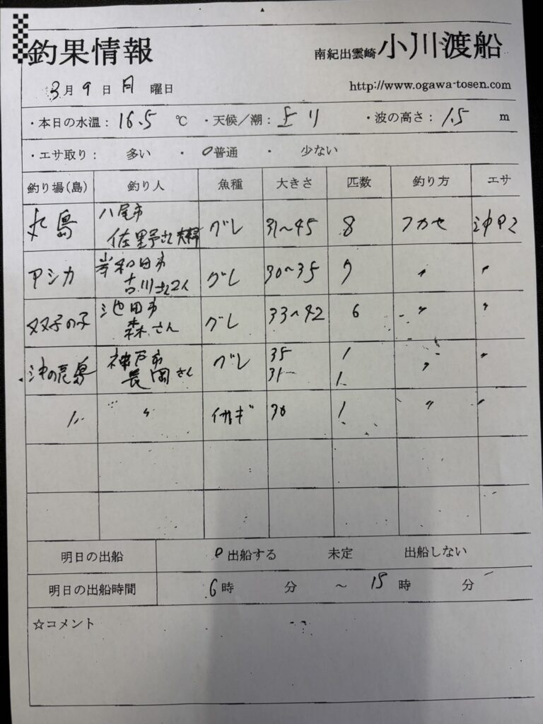 3/9 串本町出雲・小川渡船さん釣果 2026 3/09 釣果情報 【渡船釣果】串本・太地・勝浦エリア 2026年3月9日 釣果情報 【渡船釣果】串本・太地・勝浦エリア よかったらシェアしてね! URLをコピーしました! URLをコピーしました! 3/9 すさみ町江須崎・橋本渡船さん釣果 3/9みなべ町 うえひら渡船さん釣果 この記事を書いた人 tsuttarou 関連記事 3/9 すさみ町江須崎・橋本渡船さん釣果 2026年3月9日 3/9 那智勝浦町・清丸渡船さん釣果 2026年3月9日 3/8串本町出雲・小川渡船さん釣果 2026年3月8日 3/8串本町田子・双島マリンクラブ渡船さん釣果 2026年3月8日 3/8太地町・太師丸渡船さん釣果 2026年3月8日 3/8那智勝浦町・清丸渡船さん釣果 2026年3月8日 3/7 田辺・黒田渡船さんの釣果 2026年3月7日 3/7 みなべ町 築山渡船さん釣果 2026年3月7日