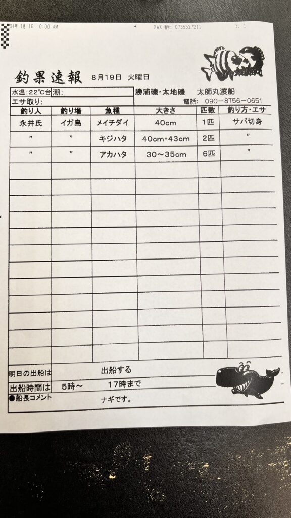 8/19太地町・太師丸渡船さん釣果 2025 8/24 【渡船釣果】串本・太地・勝浦エリア 2025年8月24日 【渡船釣果】串本・太地・勝浦エリア よかったらシェアしてね! URLをコピーしました! URLをコピーしました! 🎣【釣り人必見】同じ魚種でも当たり外れがあるのはなぜ?AIが科学的に解説 8/29串本町出雲・小川渡船さん釣果 この記事を書いた人 tsuttarou 関連記事 1/21串本町樫野・池畑渡船さん釣果 2026年1月21日 串本町袋 かわばた渡船さん釣果 2026年1月20日 1/20那智勝浦町・清丸渡船さん釣果 2026年1月20日 1/20串本町出雲・小川渡船さん釣果 2026年1月20日 1/19那智勝浦町・清丸渡船さん釣果 2026年1月19日 1/19串本町田子・双島マリンクラブ渡船さん釣果 2026年1月19日 1/19串本町出雲・小川渡船さん釣果 2026年1月19日 1/19太地町・太師丸渡船さん釣果 2026年1月19日
