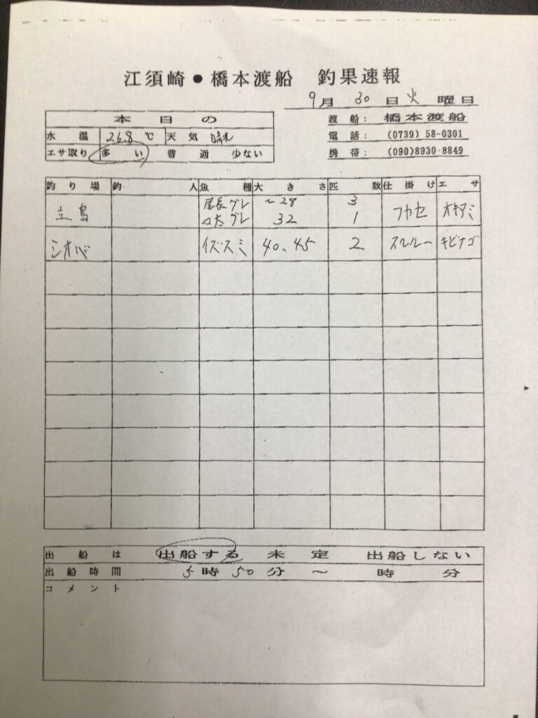 9/30すさみ町江須崎・橋本渡船さん釣果