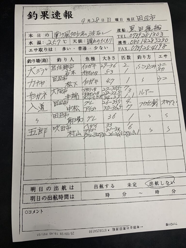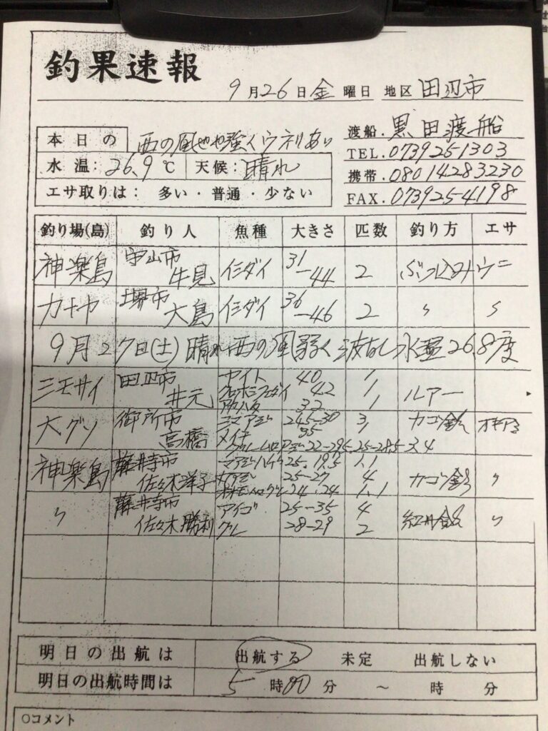 9月26日(金)27日(土)田辺・黒田渡船さんの釣果